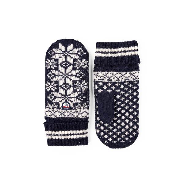 Klassischer gestrickter Fausthandschuh aus Wolle. Gestrickt in traditionellem skandinavischem Jacquardmuster aus weicher, feiner Wolle, die für zusätzliche Haltbarkeit mit etwas Polyamid gemischt wurde. Geripptes Bündchen und kleines Hestra-Logo auf dem Handrücken. Zeitloses, schönes Modell, das die Hände an milderen Herbst- und Wintertagen wärmt.