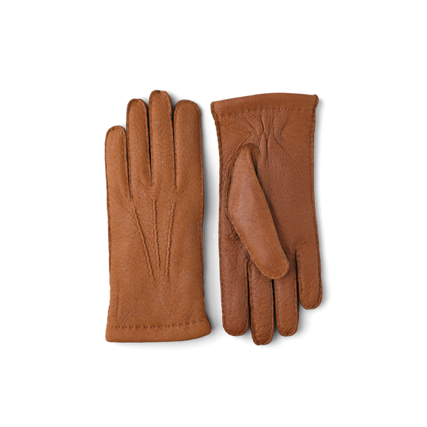 Zeitloser Handschuh mit eleganter Silhouette für Herren, handgenäht aus Peccary mit Strickfutter aus exklusivem Kaschmirgarn. Ein schöner, wärmender Handschuh im klassischen Stil, ideal für feuchtes Herbst- und Winterwetter. Der Handschuh wurde von Hestras geschickten Handschuhmachern in Ungarn von Hand aus einem Stück Leder zugeschnitten. Nur sehr wenige Menschen auf der Welt besitzen ihr Gefühl für Material und Handwerk, und jedes Handschuhpaar, das ihr Atelier verlässt, ist ein kleines Meisterwerk. Das spürt man sofort, wenn man den Handschuh anzieht – diese unvergleichliche Anschmiegsamkeit, dank der sich der Handschuh auch noch nach langjährigem Tragen perfekt an die Handform anpasst.