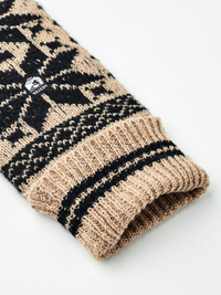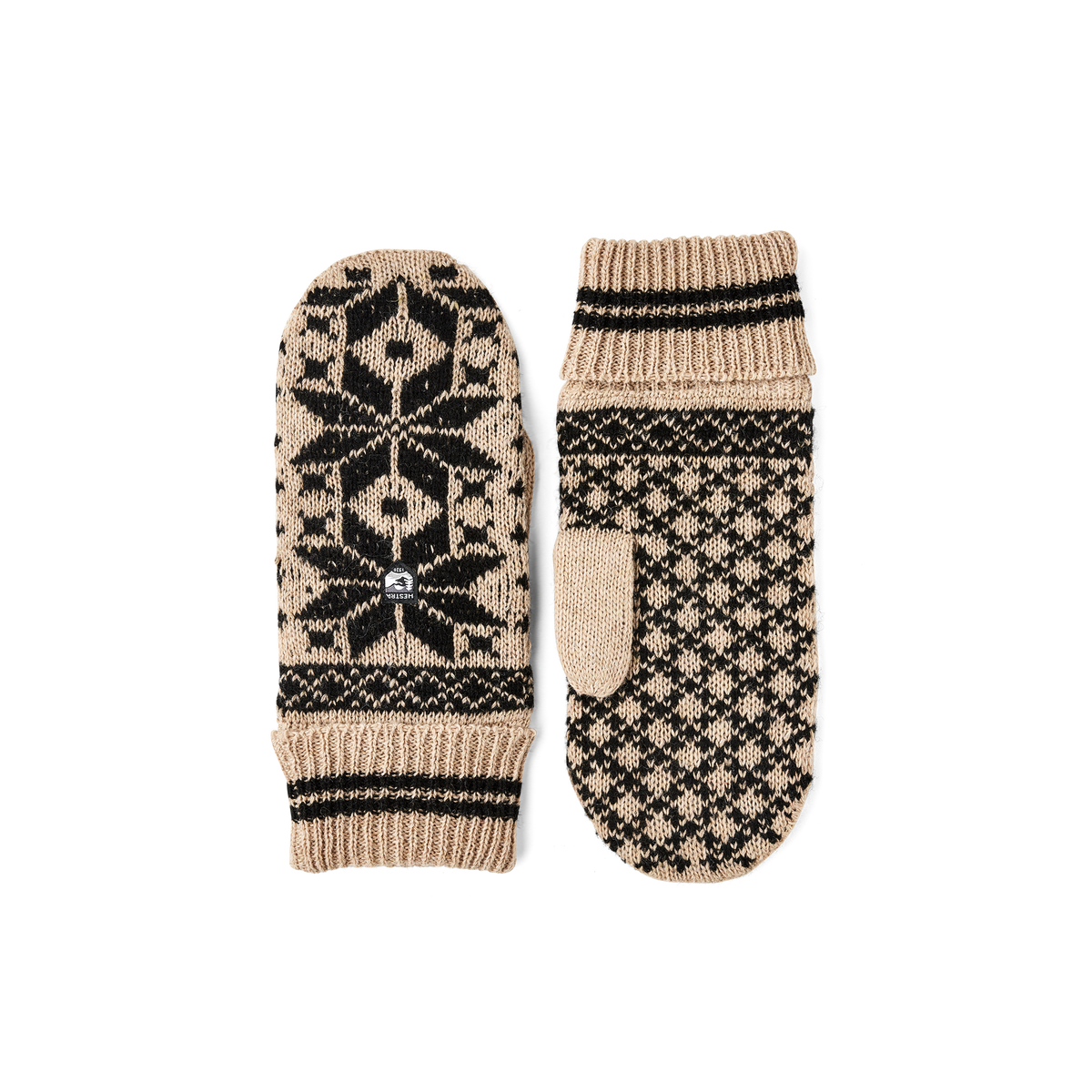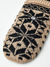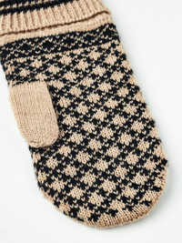 Klassischer gestrickter Fausthandschuh aus Wolle. Gestrickt in traditionellem skandinavischem Jacquardmuster aus weicher, feiner Wolle, die für zusätzliche Haltbarkeit mit etw...