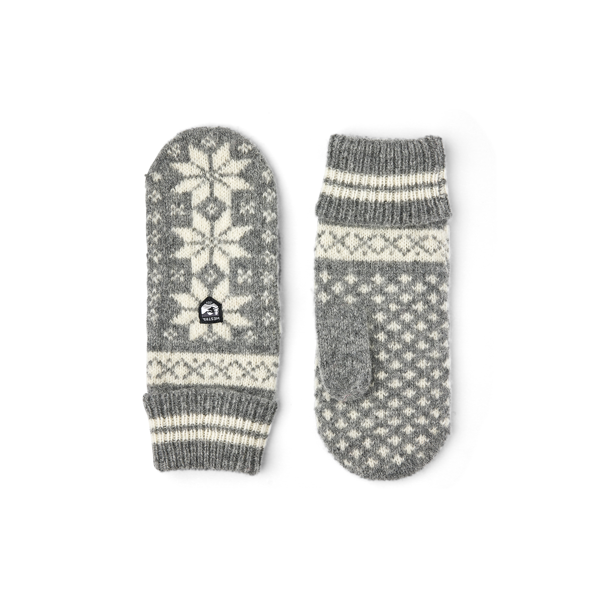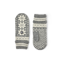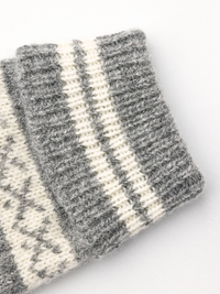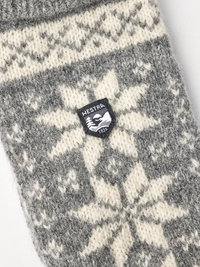 Klassischer gestrickter Fausthandschuh aus Wolle. Gestrickt in traditionellem skandinavischem Jacquardmuster aus weicher, feiner Wolle, die für zusätzliche Haltbarkeit mit etw...